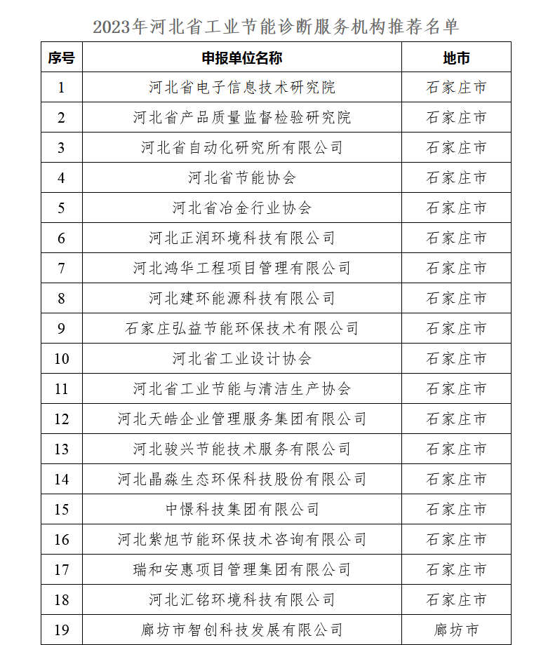 河北冀鑒入圍我省2023年度工業(yè)節(jié)能診斷服務(wù)機(jī)構(gòu)名單河北省工業(yè)和信息化廳關(guān)于2023年河北省工業(yè)節(jié)能診斷服務(wù)機(jī)構(gòu)推薦名單的公示 經(jīng)企業(yè)申報(bào)、各市推薦和專(zhuān)家審核,擬將河北省電子信息技術(shù)研究院等52家單位做為2023年河北省工業(yè)節(jié)能診斷服務(wù)機(jī)構(gòu)推薦名單,現(xiàn)予公示。公示期間如有異議,請(qǐng)實(shí)名以書(shū)面形式向我廳提出?! 」緯r(shí)間:6月16日至6月25日 聯(lián)系電話(huà):0311-87800807 87801583(傳真) 附件:2023年河北省工業(yè)節(jié)能診斷服務(wù)查看詳情>>