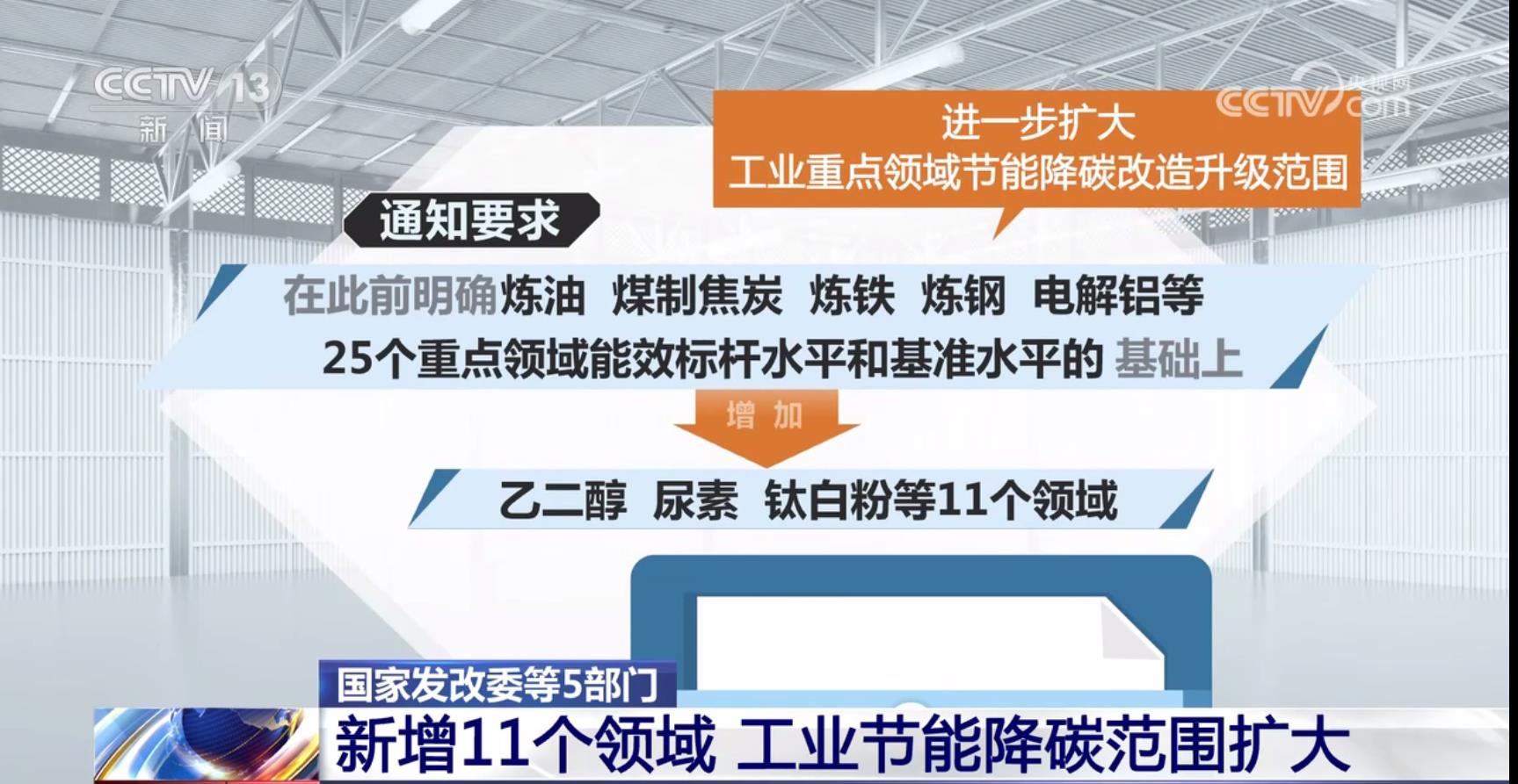 央視網(wǎng):新增11個(gè)領(lǐng)域 工業(yè)節(jié)能降碳范圍擴(kuò)大國(guó)家發(fā)改委等五部門(mén)發(fā)文通知,在原25個(gè)重點(diǎn)領(lǐng)域能效標(biāo)桿和基準(zhǔn)水平的基礎(chǔ)上,新增11個(gè)領(lǐng)域查看詳情>>