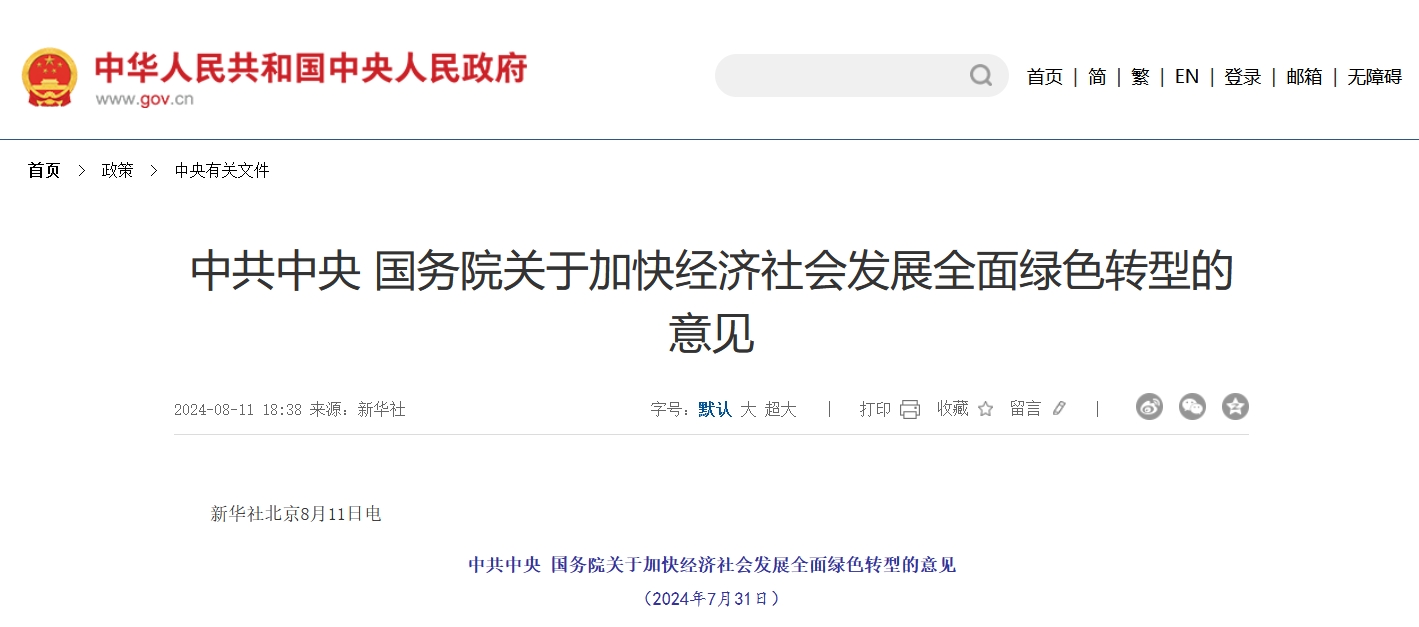 中共中央 國(guó)務(wù)院關(guān)于加快經(jīng)濟(jì)社會(huì)發(fā)展全面綠色轉(zhuǎn)型的意見中共中央 國(guó)務(wù)院關(guān)于加快經(jīng)濟(jì)社會(huì)發(fā)展全面綠色轉(zhuǎn)型的意見(2024年7月31日)推動(dòng)經(jīng)濟(jì)社會(huì)發(fā)展綠色化、低碳化,是新時(shí)代黨治國(guó)理政新理念新實(shí)踐的重要標(biāo)志,是實(shí)現(xiàn)高質(zhì)量發(fā)展的關(guān)鍵環(huán)節(jié),是解決我國(guó)資源環(huán)境生態(tài)問題的基礎(chǔ)之策,是建設(shè)人與自然和諧共生現(xiàn)代化的內(nèi)在要求。為加快經(jīng)濟(jì)社會(huì)發(fā)展全面綠色轉(zhuǎn)型,現(xiàn)提出如下意見。一、總體要求堅(jiān)持以習(xí)近平新時(shí)代中國(guó)特色社會(huì)主義思想為指導(dǎo),深入貫徹黨的二十大和二十屆二中、三中查看詳情>>