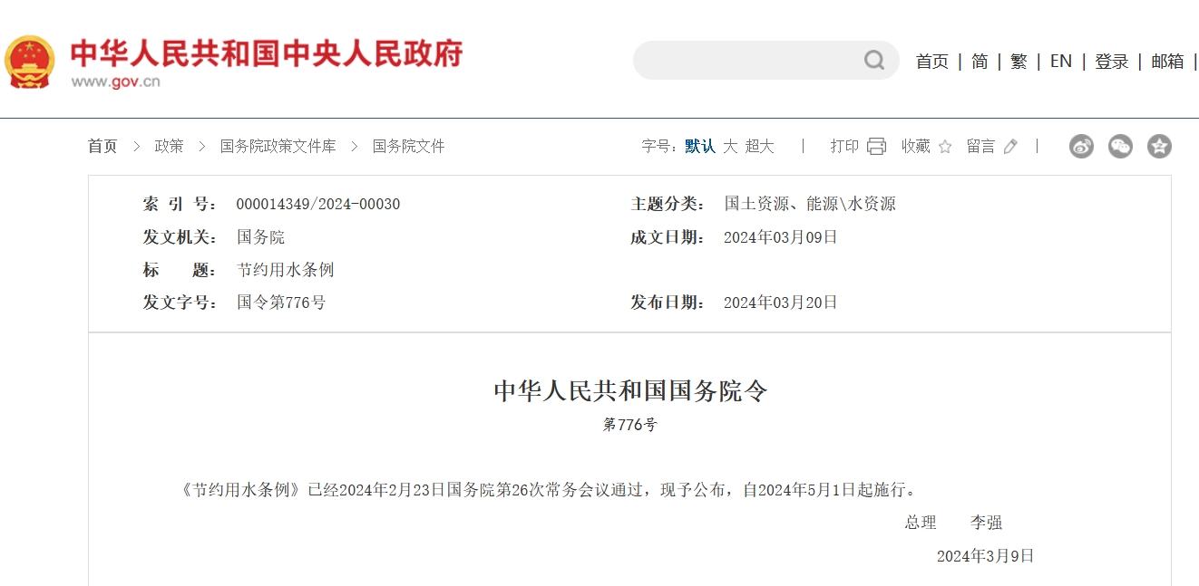 節(jié)約用水條例將于5月1日實(shí)施中華人民共和國(guó)國(guó)務(wù)院令第776號(hào)《節(jié)約用水條例》已經(jīng)2024年2月23日國(guó)務(wù)院第26次常務(wù)會(huì)議通過(guò),現(xiàn)予公布,自2024年5月1日起施行??偫怼 ±顝?qiáng) 2024年3月9日 節(jié) 約 用 水 條 例第一章 總 則第一條 為了促進(jìn)全社會(huì)節(jié)約用水,保障國(guó)家水安全,推進(jìn)生態(tài)文明建設(shè),推動(dòng)高質(zhì)量發(fā)展,根據(jù)《中華人民共和國(guó)水法》等有關(guān)法律,制定本條例。第二條 本條例所稱節(jié)約用水(以下簡(jiǎn)稱查看詳情>>
