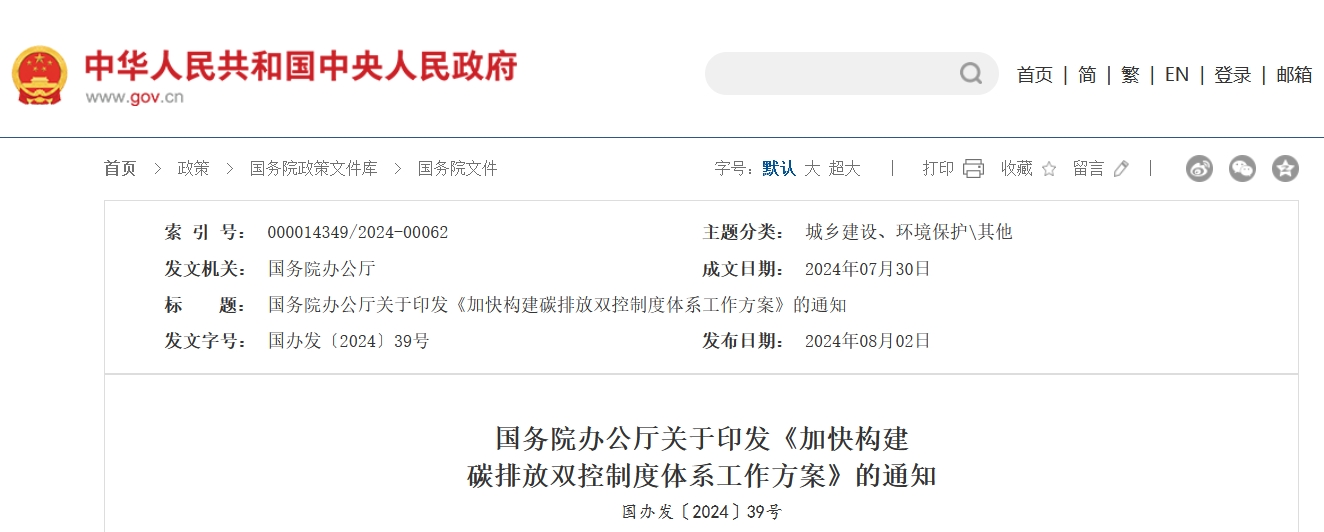 國務(wù)院辦公廳關(guān)于印發(fā)《加快構(gòu)建碳排放雙控制度體系工作方案》的通知國務(wù)院辦公廳關(guān)于印發(fā)《加快構(gòu)建碳排放雙控制度體系工作方案》的通知國辦發(fā)〔2024〕39號(hào)各省、自治區(qū)、直轄市人民政府,國務(wù)院各部委、各直屬機(jī)構(gòu):《加快構(gòu)建碳排放雙控制度體系工作方案》已經(jīng)國務(wù)院同意,現(xiàn)印發(fā)給你們,請(qǐng)結(jié)合實(shí)際認(rèn)真貫徹執(zhí)行。國務(wù)院辦公廳 2024年7月30日 (本文有刪減)加快構(gòu)建碳排放雙控制度體系工作方案為貫徹落實(shí)黨中央、國務(wù)院決策部署,建立能耗雙控向碳排放查看詳情>>