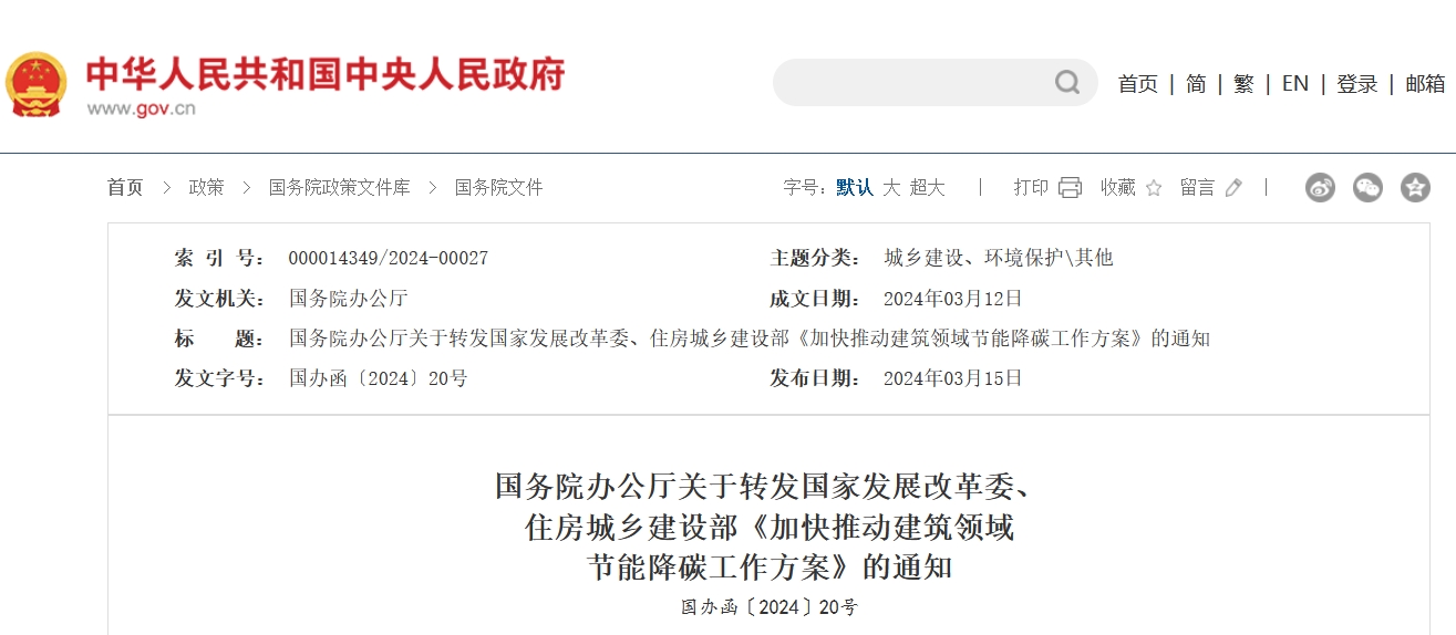 國(guó)家發(fā)展改革委、住房城鄉(xiāng)建設(shè)部《加快推動(dòng)建筑領(lǐng)域節(jié)能降碳工作方案》國(guó)務(wù)院辦公廳關(guān)于轉(zhuǎn)發(fā)國(guó)家發(fā)展改革委、住房城鄉(xiāng)建設(shè)部《加快推動(dòng)建筑領(lǐng)域節(jié)能降碳工作方案》的通知國(guó)辦函〔2024〕20號(hào)各省、自治區(qū)、直轄市人民政府,國(guó)務(wù)院各部委、各直屬機(jī)構(gòu):國(guó)家發(fā)展改革委、住房城鄉(xiāng)建設(shè)部《加快推動(dòng)建筑領(lǐng)域節(jié)能降碳工作方案》已經(jīng)國(guó)務(wù)院同意,現(xiàn)轉(zhuǎn)發(fā)給你們,請(qǐng)認(rèn)真貫徹落實(shí)。國(guó)務(wù)院辦公廳 2024年3月12日 ?。ù思_發(fā)布)加快推動(dòng)建筑領(lǐng)域節(jié)能降碳工作方案國(guó)家發(fā)展改革委查看詳情>>