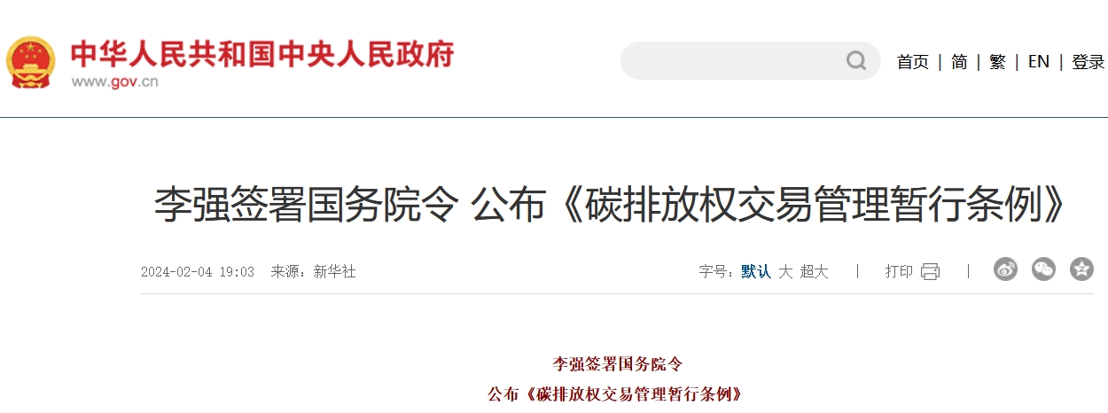李強(qiáng)簽署國(guó)務(wù)院令 公布《碳排放權(quán)交易管理暫行條例》李強(qiáng)簽署國(guó)務(wù)院令公布《碳排放權(quán)交易管理暫行條例》新華社北京2月4日電 國(guó)務(wù)院總理李強(qiáng)日前簽署國(guó)務(wù)院令,公布《碳排放權(quán)交易管理暫行條例》(以下簡(jiǎn)稱《條例》),自2024年5月1日起施行。碳排放權(quán)交易是通過市場(chǎng)機(jī)制控制和減少二氧化碳等溫室氣體排放、助力積極穩(wěn)妥推進(jìn)碳達(dá)峰碳中和的重要政策工具。制定專門行政法規(guī),為全國(guó)碳排放權(quán)交易市場(chǎng)運(yùn)行管理提供明確法律依據(jù),保障和促進(jìn)其健康發(fā)展,具有重要意義?!稐l例》總查看詳情>>
