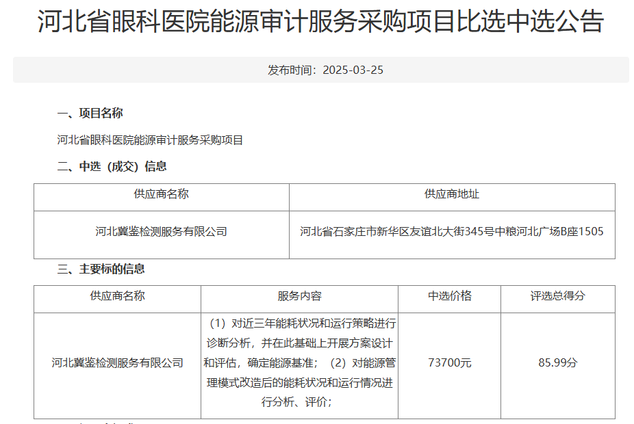 中標(biāo)喜報(bào)憑借良好的信譽(yù)、行業(yè)經(jīng)驗(yàn)、堅(jiān)實(shí)的技術(shù)能力及優(yōu)秀的方案,我公司最終順利中標(biāo)“河北省眼科醫(yī)院能源審計(jì)服務(wù)采購項(xiàng)目”。 風(fēng)起云涌新時(shí)代,破浪前行正當(dāng)時(shí)。河北冀鑒檢測服務(wù)有限公司將緊抓機(jī)遇,迎接挑戰(zhàn),不斷提升審計(jì)服務(wù)水平。查看詳情>>
